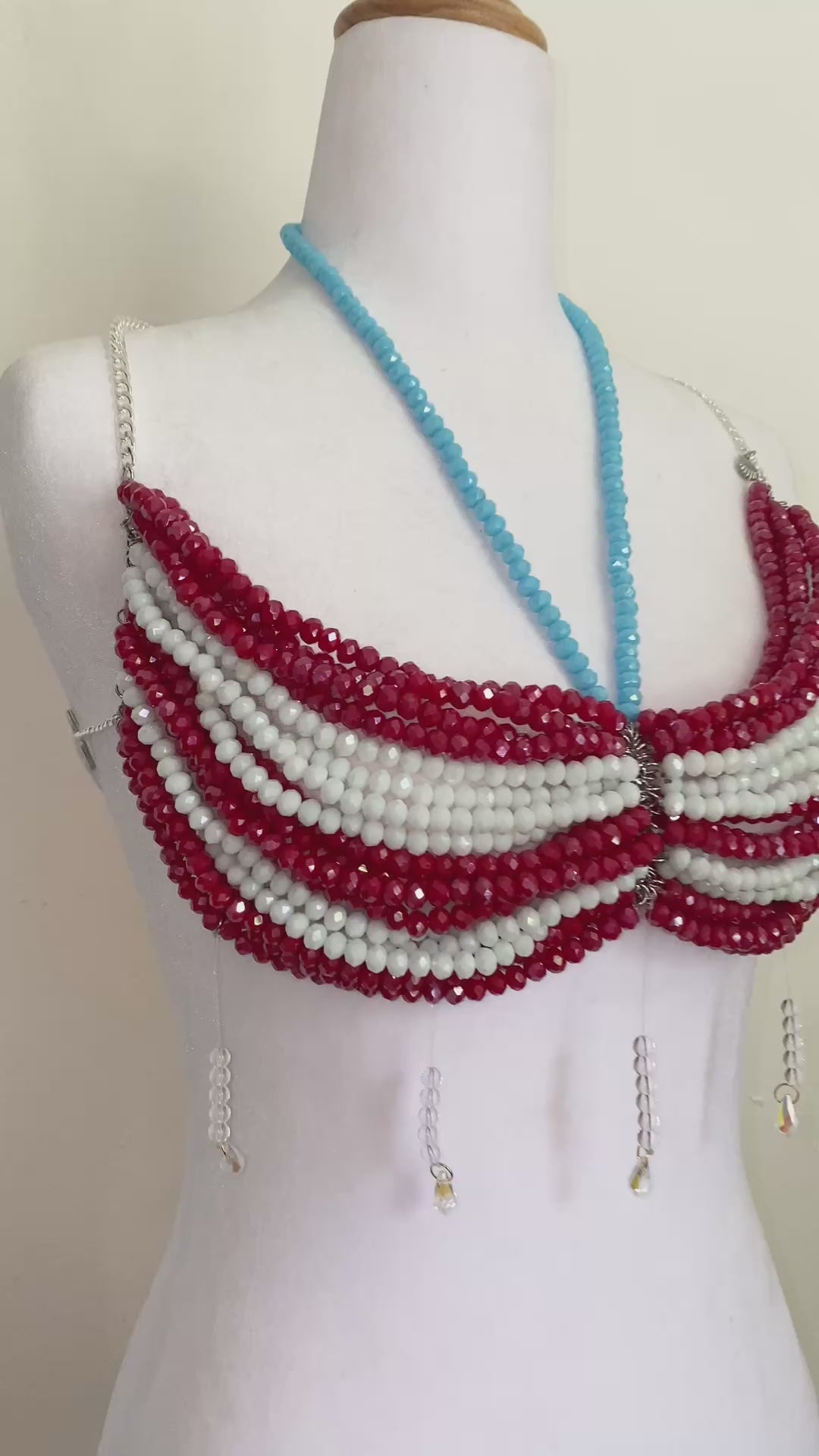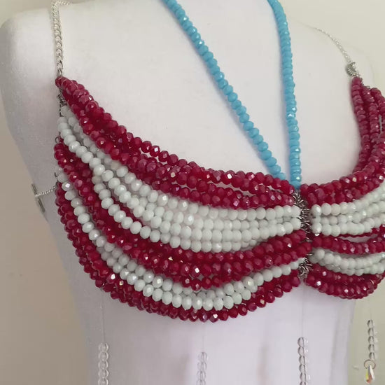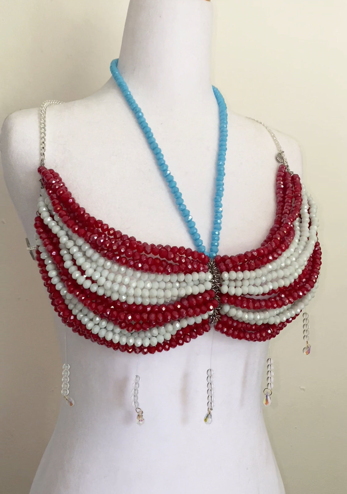 Top artesanal inspirado en la bandera de Puerto Rico, elaborado a mano con beads de cristal montado sobre una resistente cadena de acero inoxidable.