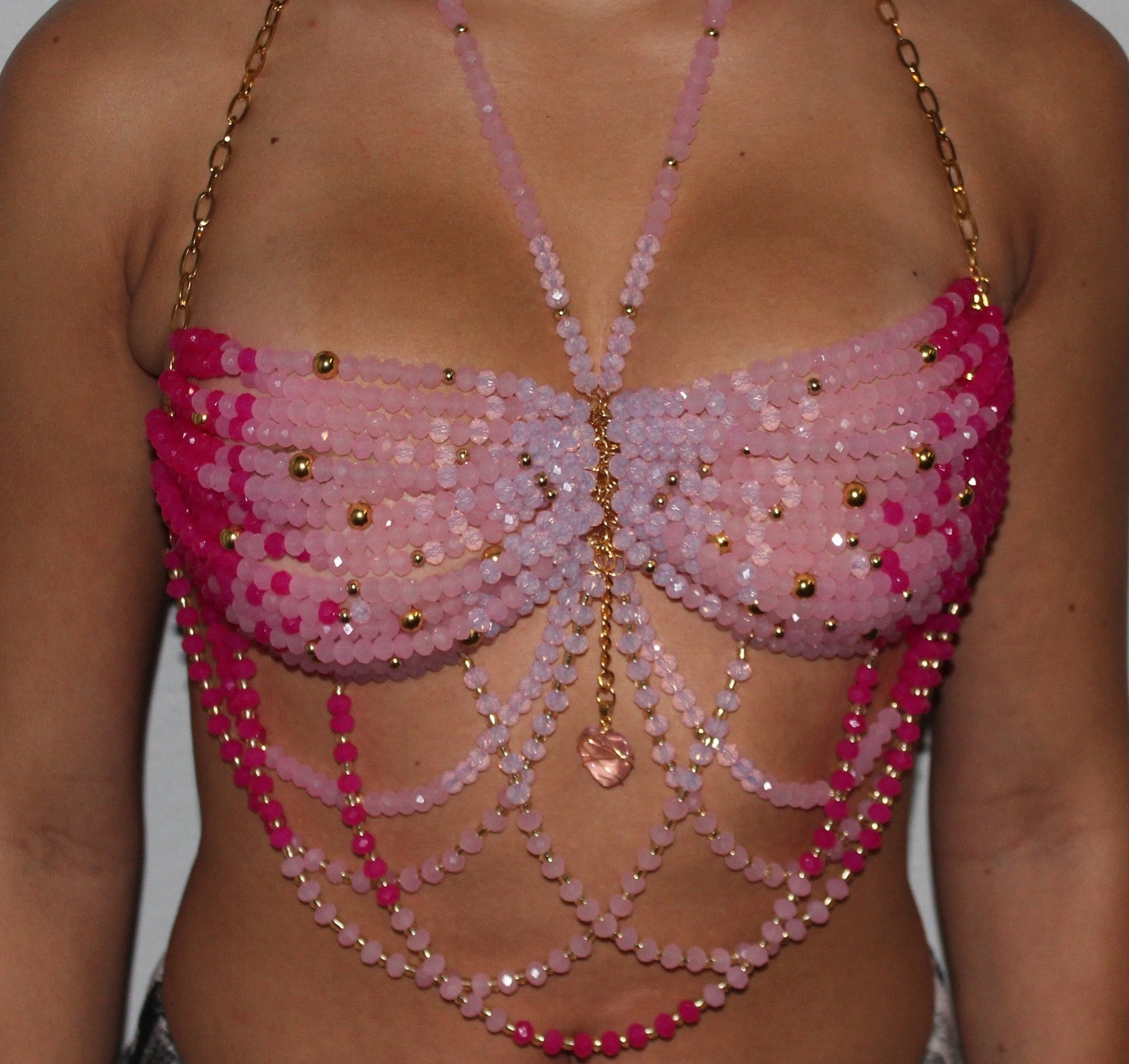 Top artesanal en tonos rosas en degradado, elaborado a mano con beads de cristal, montado sobre una resistente cadena de acero inoxidable y baño en oro 24K.